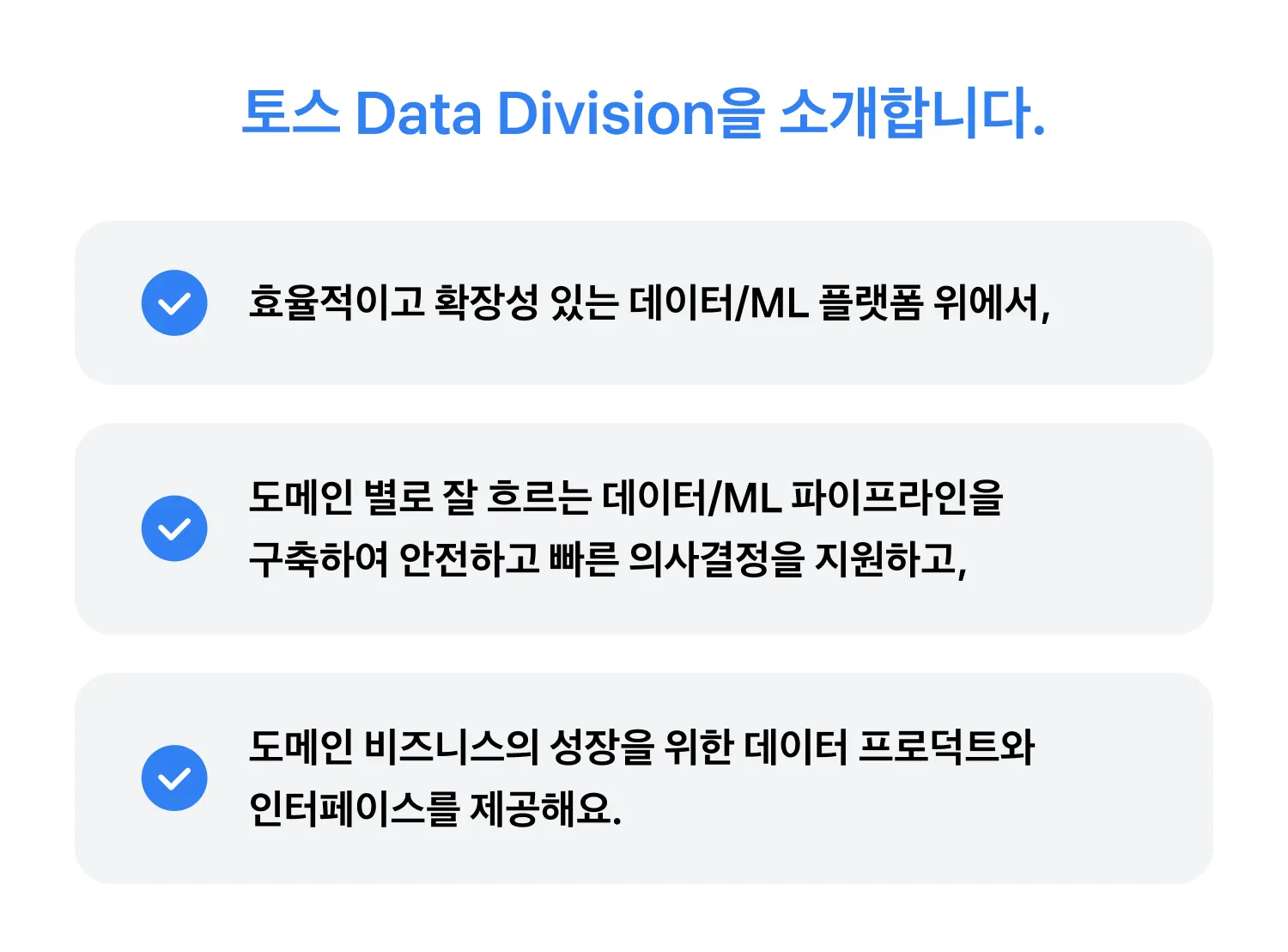 토스팀이 데이터 기반의 의사결정을 보다 잘 할 수 있도록 로그 자동화, 단순 데이터 추출 최소화, 데이터 소스 일원화 등 생산성 및 데이터 퀄리티 향상에 집중해요.